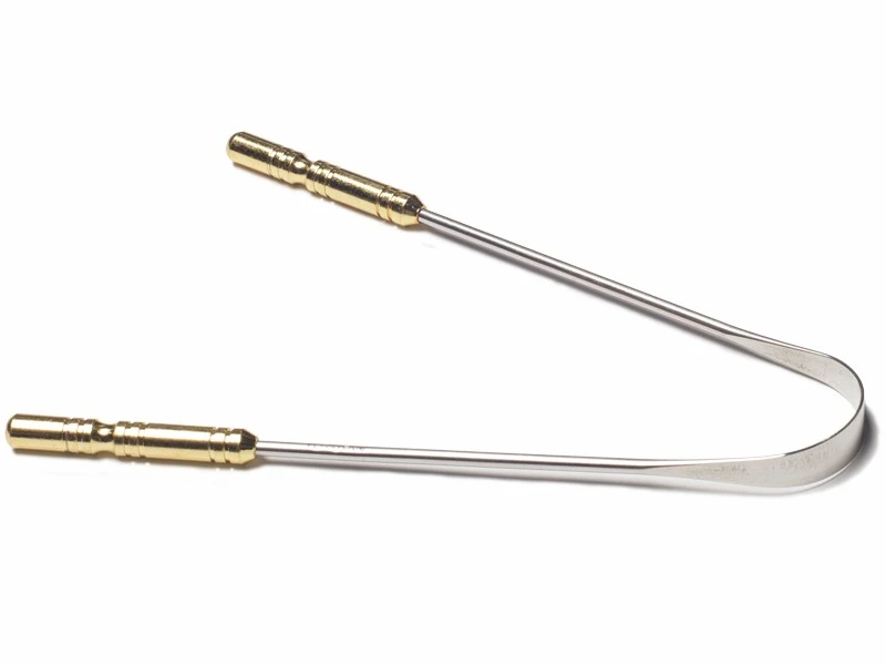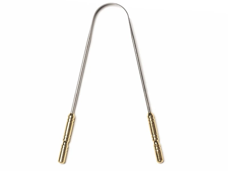 Gratte langue en inox de haute qualité. Idéal pour enlever la pâte blanche (Âma) produite par la flore bactérienne de la surface de la langue. Le gratte langue est employé en Inde depuis plus de 6000 ans pour la pratique du « Hrid dhauti ».
