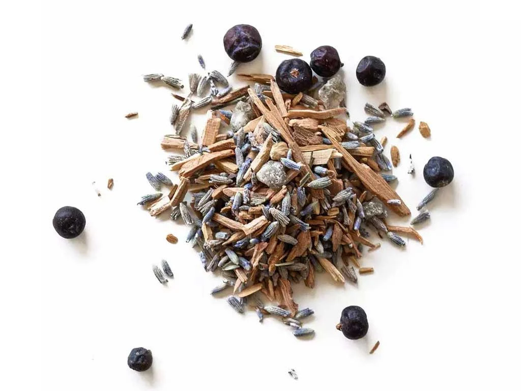 Bois de santal blanc, bois de cade, résine de benjoin, lavandin*, baies de genièvre*.
