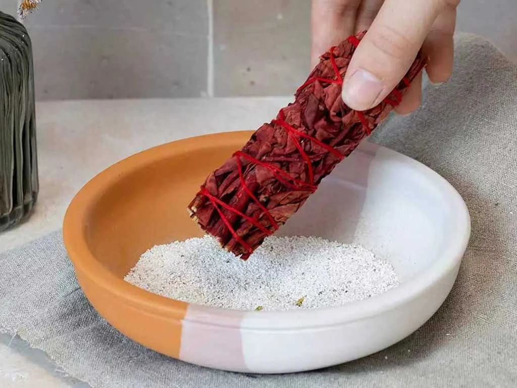 Enflammez votre tresse de sauge, de cèdre ou de genévrier, ou encore votre bâton de palo santo. Une fois enflammés, déposez-les dans le vase rituel.